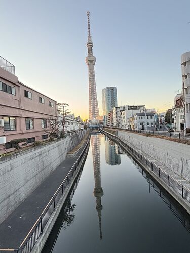 2026年1月12日東京メトロ半蔵門線を乗り継いで、東京スカイツリーの近くまで行ってきました。 スカイツリーの場所はこの辺り。東京メトロの押上駅近くです。 しかしスカイツリーには登らず、東に向かいます。 隅田川に流れていく北十間川に掛かる西十間橋と…