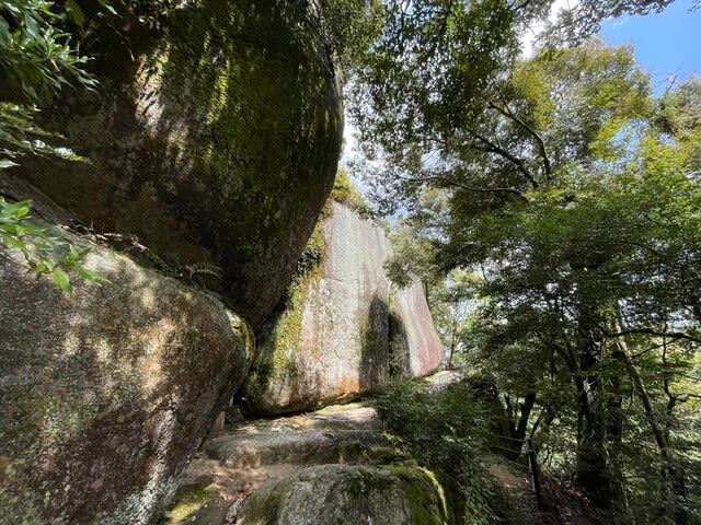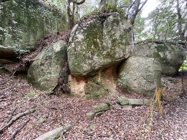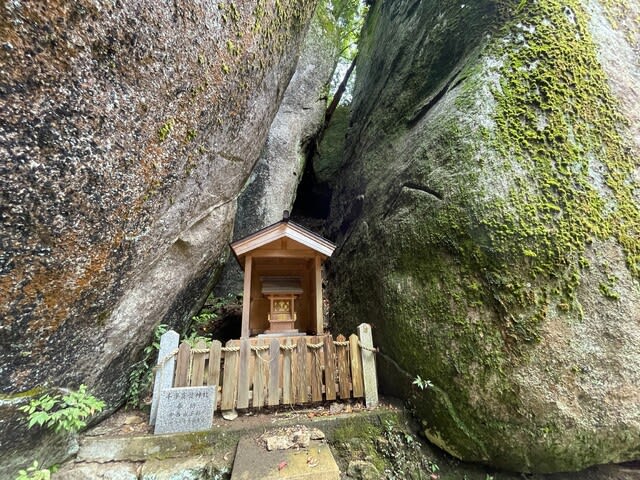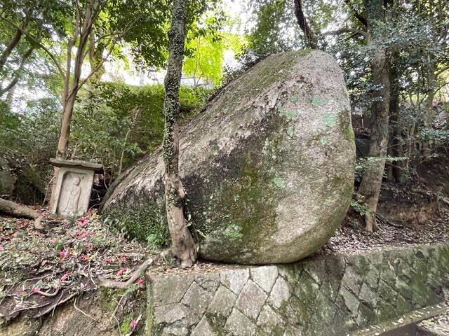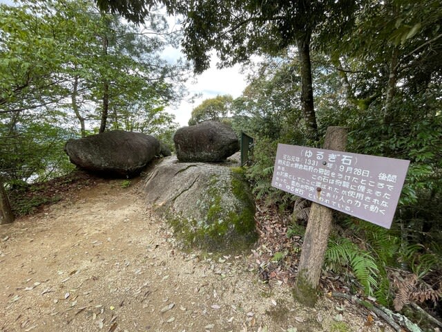 笠置石。天智天皇の皇子が馬に乗って石の上から落ちそうになったのを、神に救いを求めたところ、無事助かったという伝説があります。
