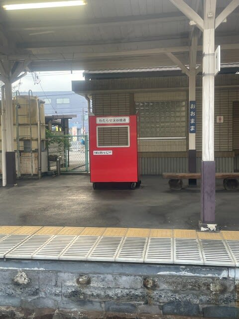 大間々駅にもわっしー。中に入れそうです。