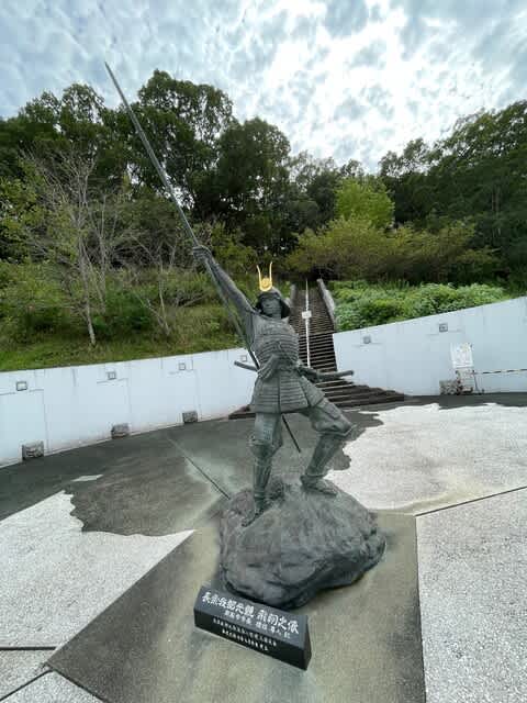 イケメン長宗我部元親の飛翔之像、槍を持って天を突いてます。