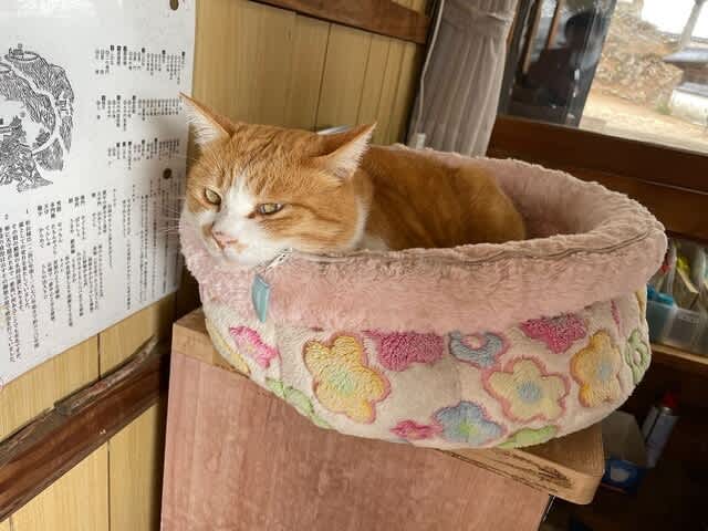 チケット販売の事務所内の寝床でぬくぬくしています。今日は寒くて、お城の見回りはしないんですって。