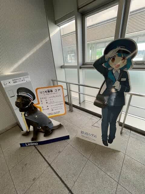 犬の駅長コアさんと鉄道むすめの八草みずきさん。
