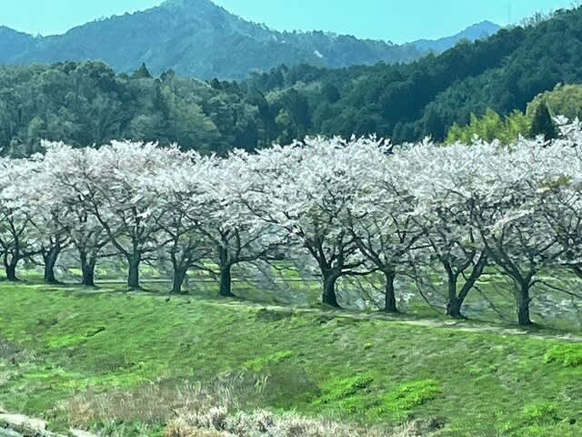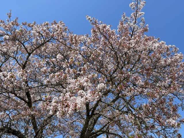 バスの車中から見えた桜並木。良かった、まだ咲いています。