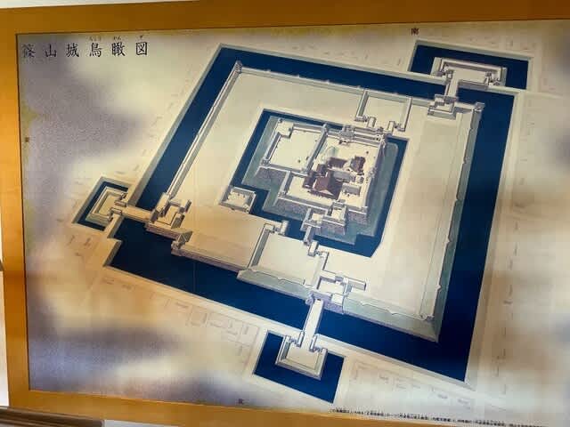 見掛けた篠山城の鳥観図。3つの馬出しが特徴的です。天守が無いのですよ。