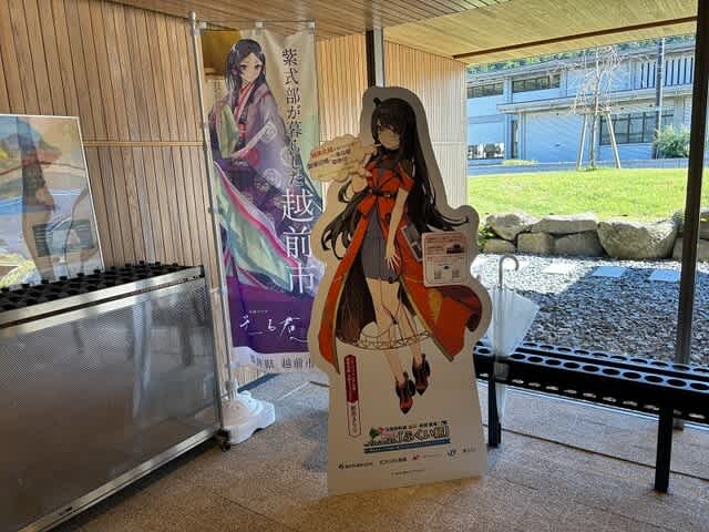 ふくいブランド大使の越美きららたんと今年の大河ドラマのヒロイン紫式部さんがお出迎え。