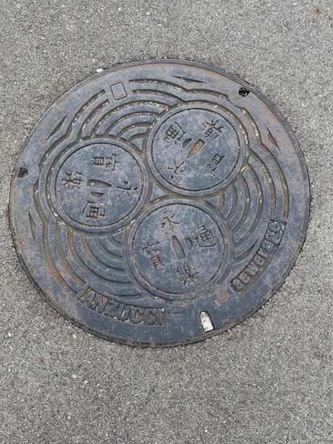 JR安土駅に戻る途中で見たマンホール。永楽通宝が描かれていました。