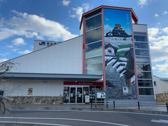 安土駅に戻ってきました。安土城が壁に描かれていますよ。