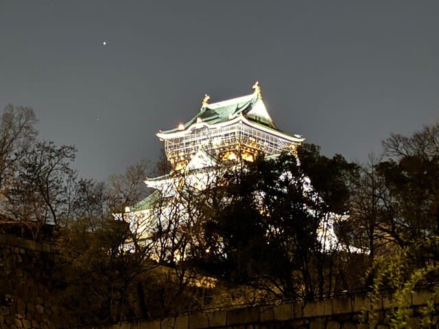 見えてきました、大阪城。ライトアップされていますね。