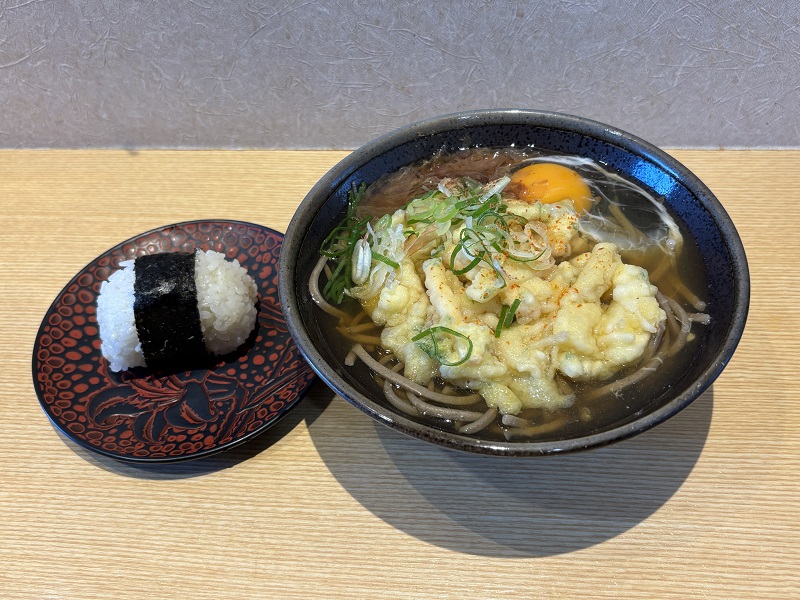 卵天ぷらそば+おにぎり(おかか)で640円。